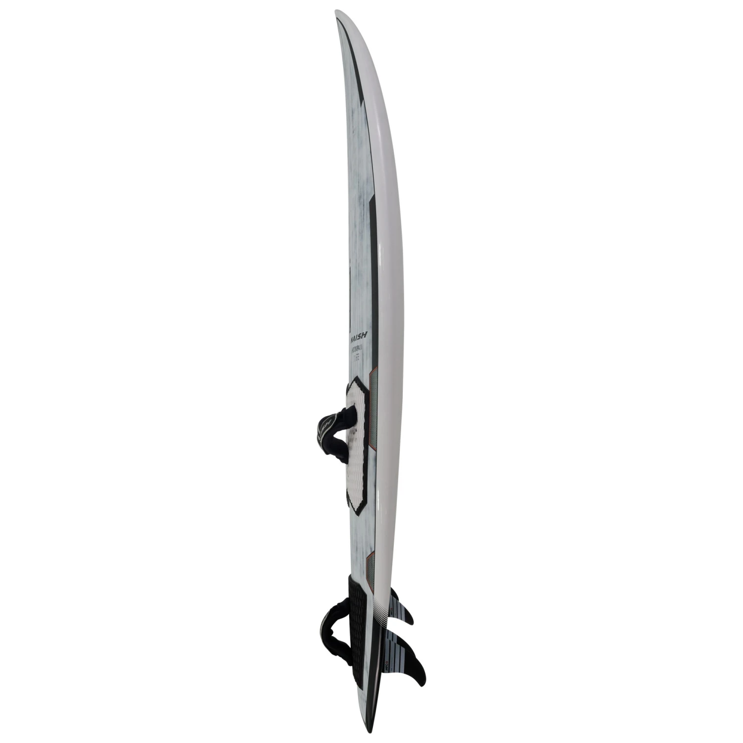 The bottom shape features a single concave nose entry area that transforms into a double concave mid section carrying the drive on the tail into a flat release. This creates a straighter scoop rocker line in the midsection while keeping the curve in the rail. The flat center line delivers speed and planing power. The rails start with a soft edge in the nose that carries through the midsection and transfers into a surfboard style sharp release in the tail section. This rail design gives the board secure drive through the bottom turn even in choppy conditions while providing a clean release in the top turn.