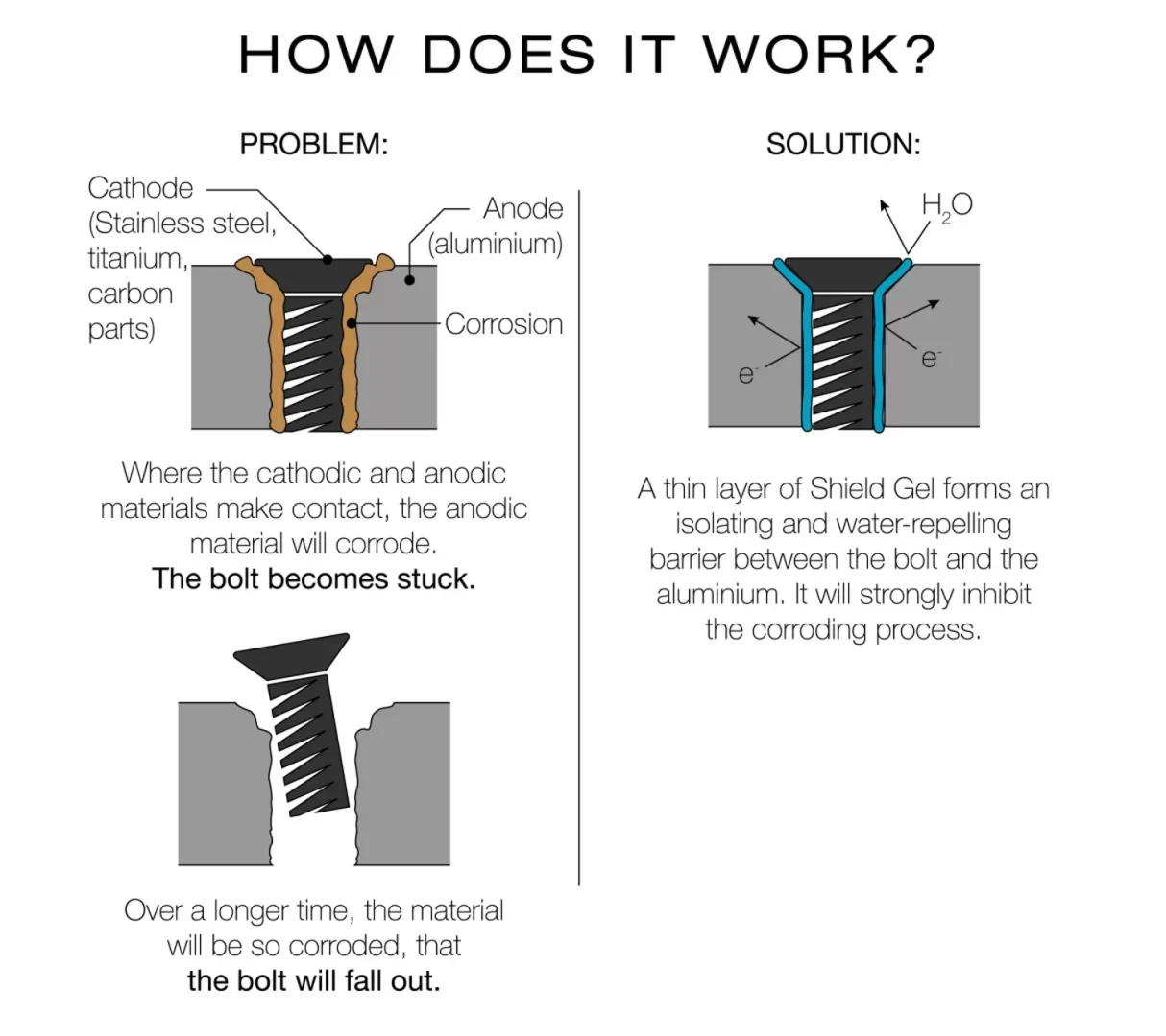 Die isolierenden und wasserabweisenden Eigenschaften des Shield Gel schaffen eine Barriere zwischen den Schrauben und dem Aluminium und verhindern so den Korrosionsprozess.